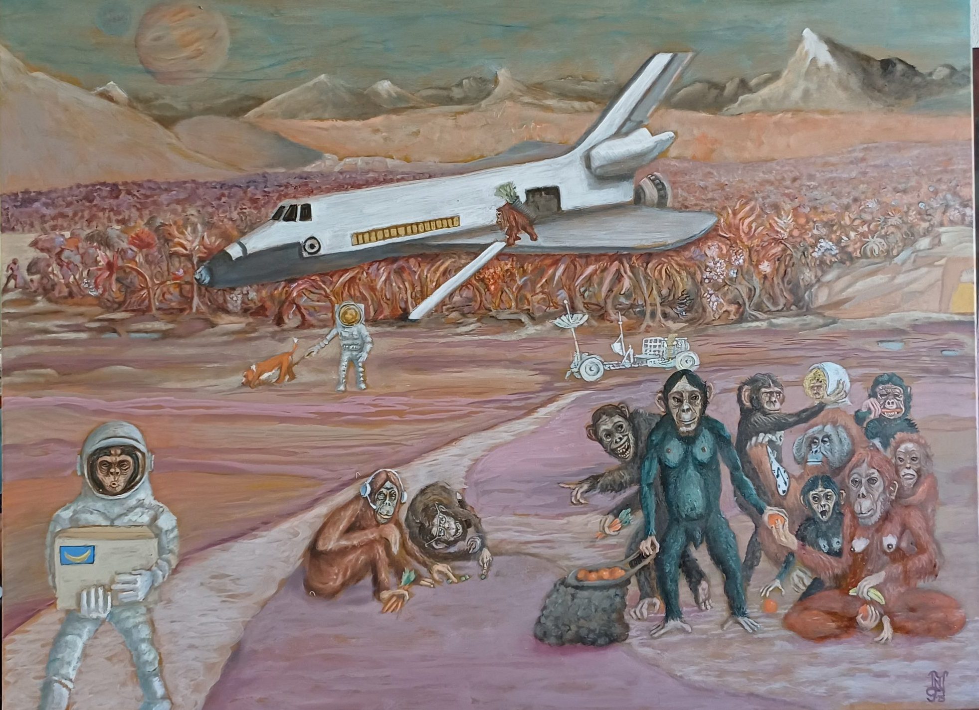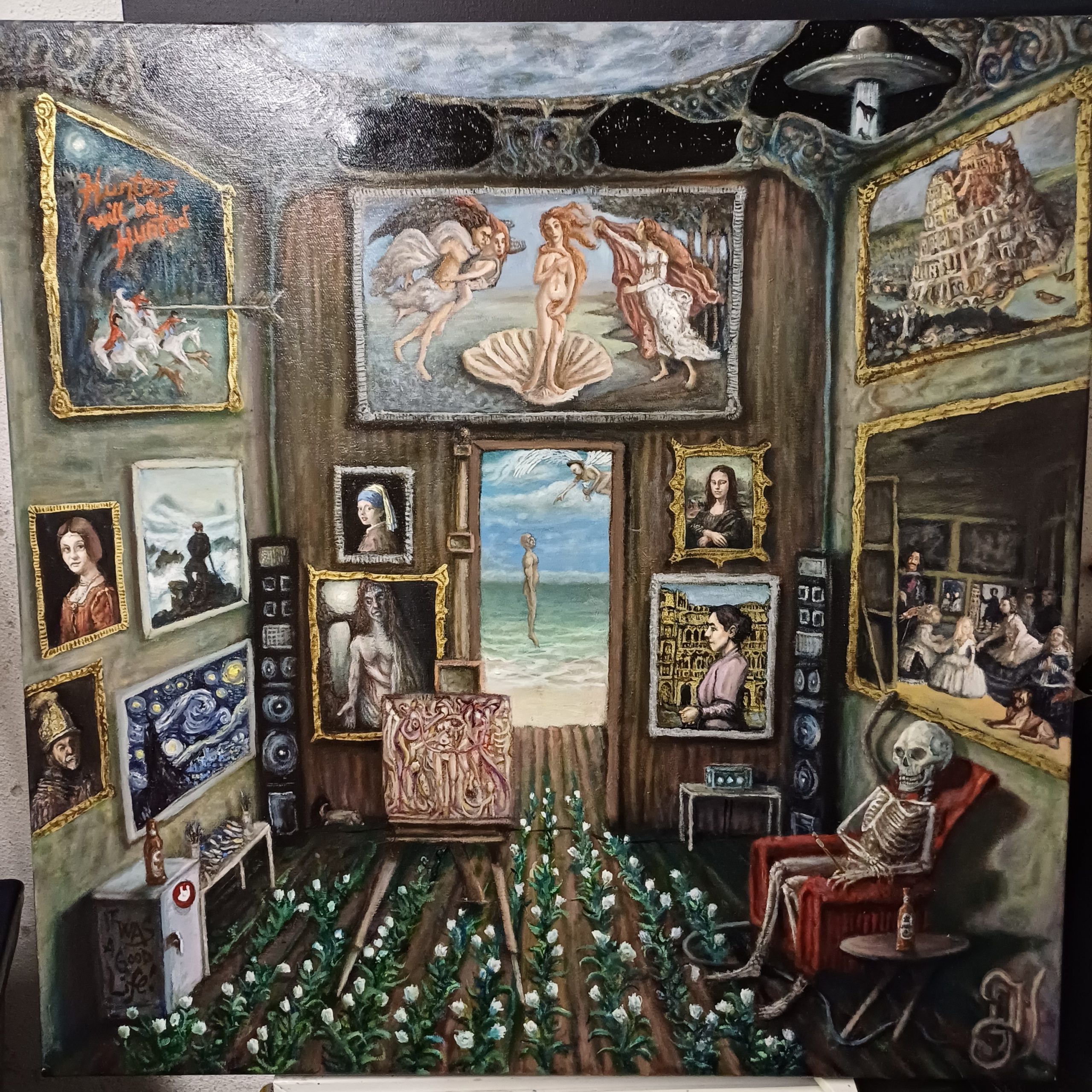 After the death of a dear painter I did this one. It is a world beyond ours, where he now is waiting for …more to come. 2019 oil on cnvas, 60*80cm, for sale