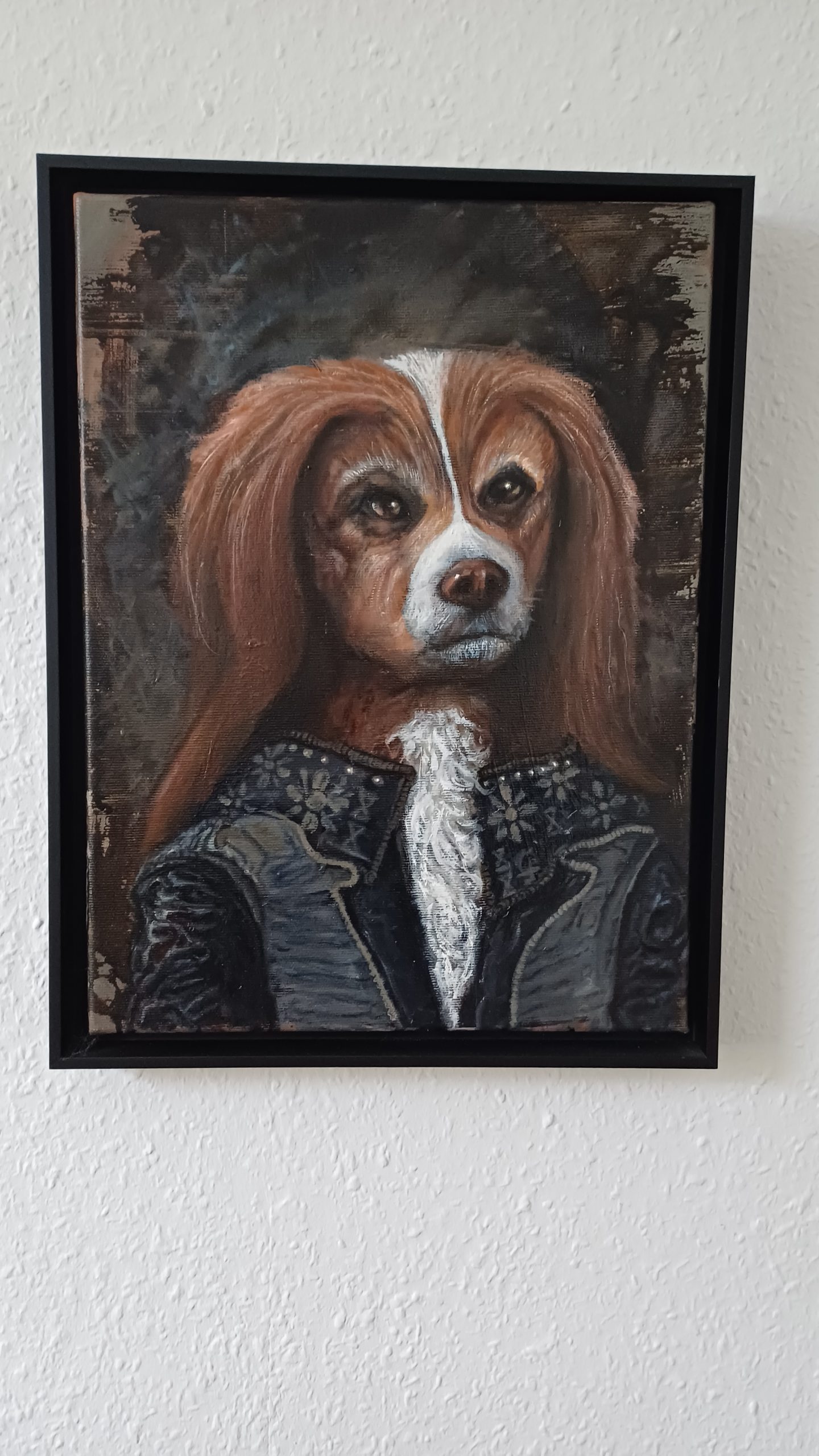 Dog painted in portrait like a historic costume, 50cm * 70cm, oil on canvas. Not for sale (it is my dog)